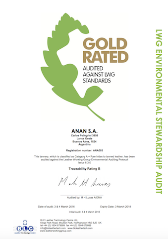 Anan S.A esta certificada en el protocolo LWG (Leather Working Group) logrando la medalla de ORO, que refleja el compromiso que la empresa tiene con el cliente y el medio ambiente